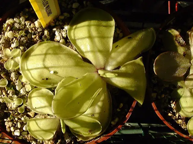 The life cycle of this Pinguicula from Mexico has two seasons, one wet and the other dry (see link). The leaf rosettes of the plant are different according to the season. During the resting months (winter) the plant develops a small succulent rosette made of numerous non-carnivorous leaves. The carnivorous leaves are produced in spring and during all summer growth. The life cycle of the plant is probably similar in it’s native habitat but I have no data.