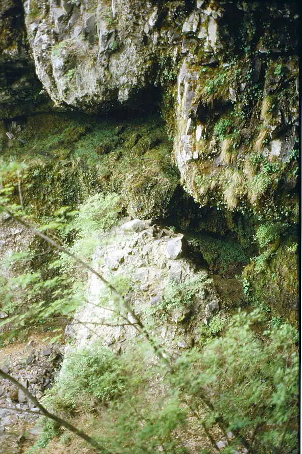 The rock walls of Mt. Koshin-zan are so weathered, they are falling apart. Reasons for this include increased use by mountain climbers and death of the trees on the wall due to acid rain and grazing by deer. The habitat of P. ramosa in Mt. Koshin-zan is now facing a crisis. (Source : Michiaki Mabuchi)