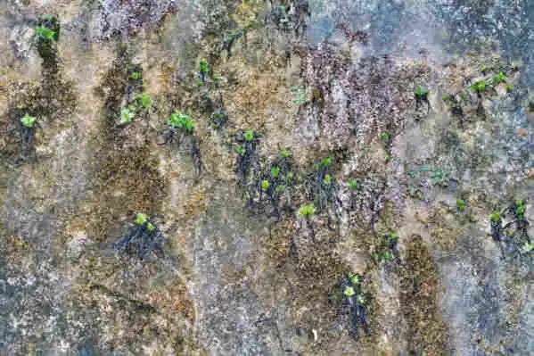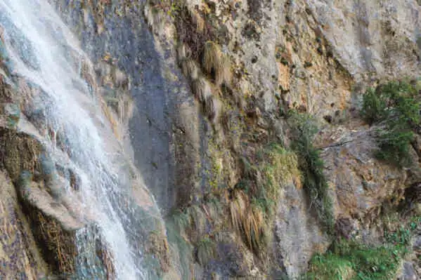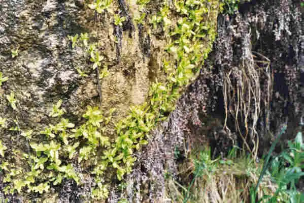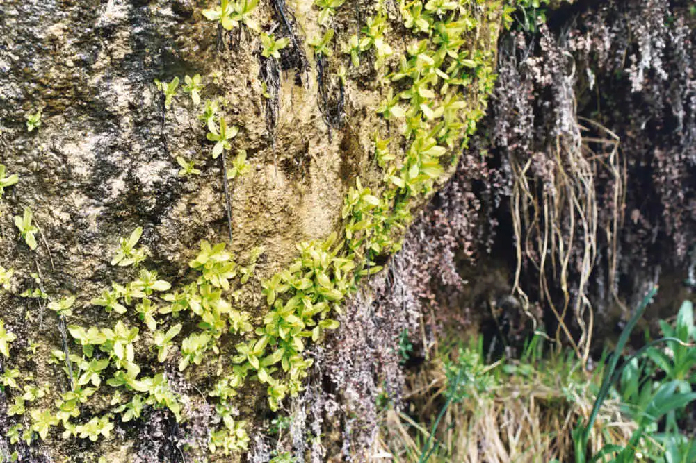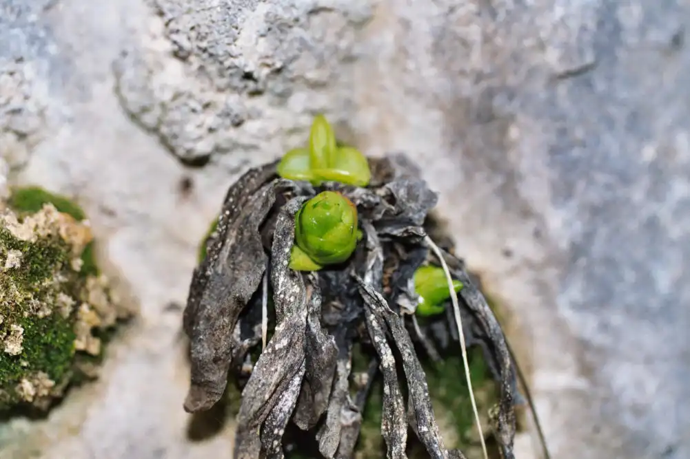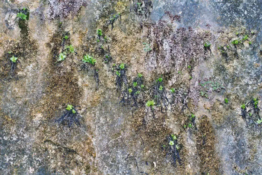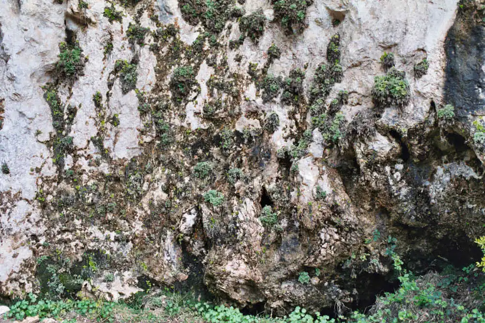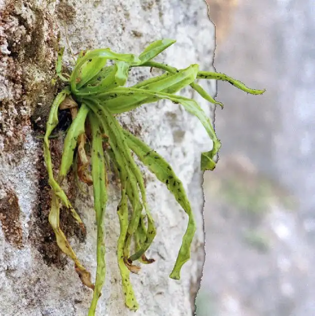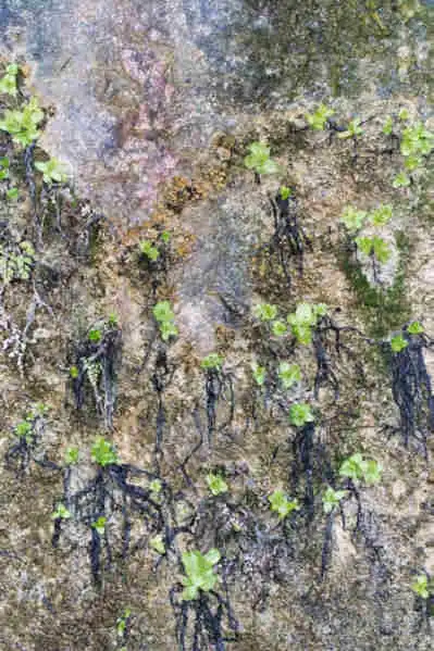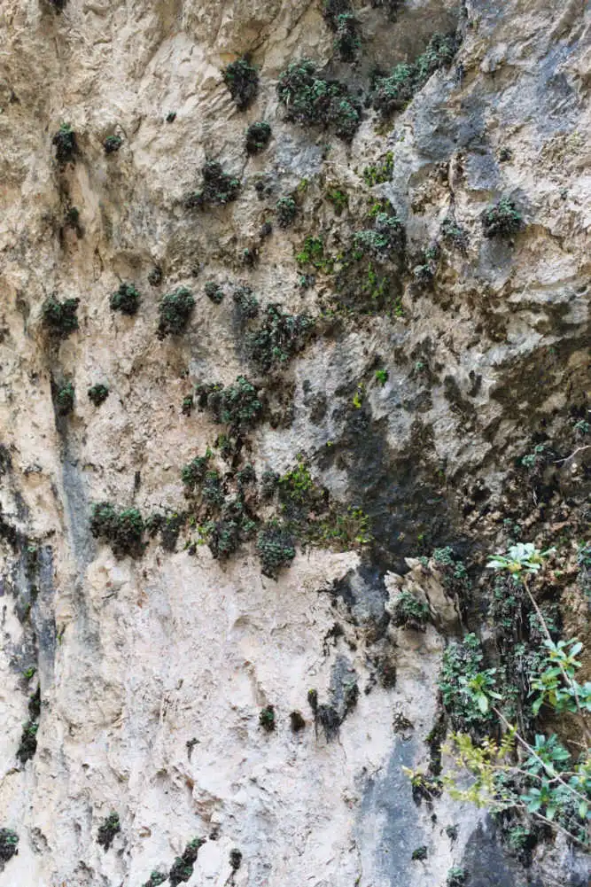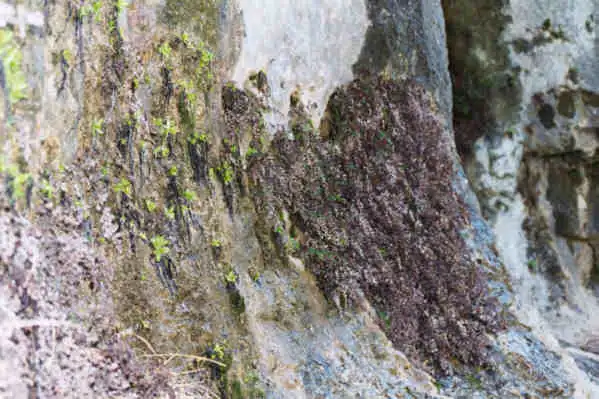 Grows on vertical limestone rock walls, below overhanging rock parts in niches protected from direct rainfall. The plants in some locations grow near falls and are in very wet area.