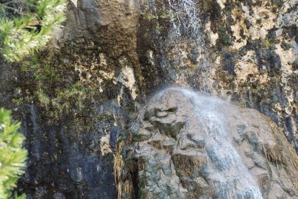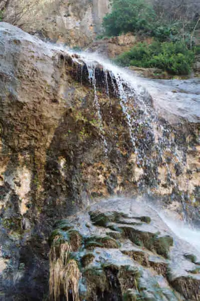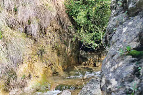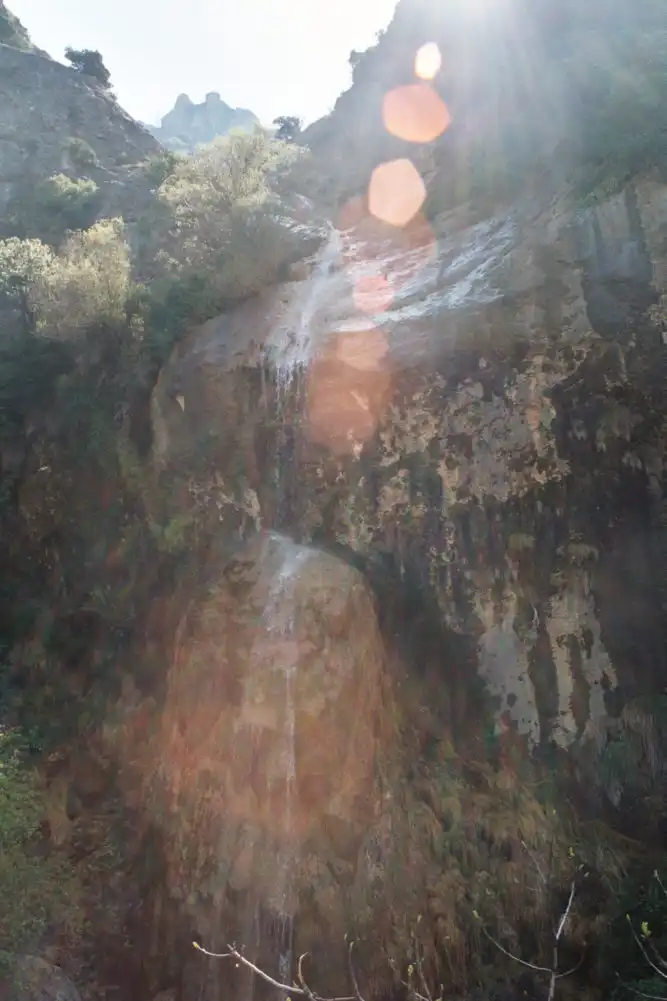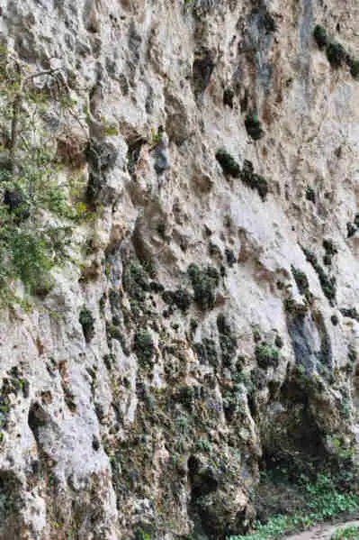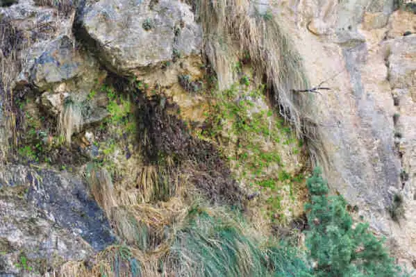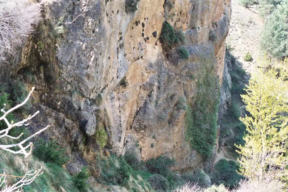 Cerrada de Elias is a gorge with vertical cliffs on the two sides. The plants are the bright green spots on the right. Photo : Eric Partrat - April 2003 - |