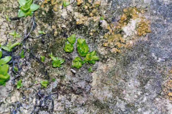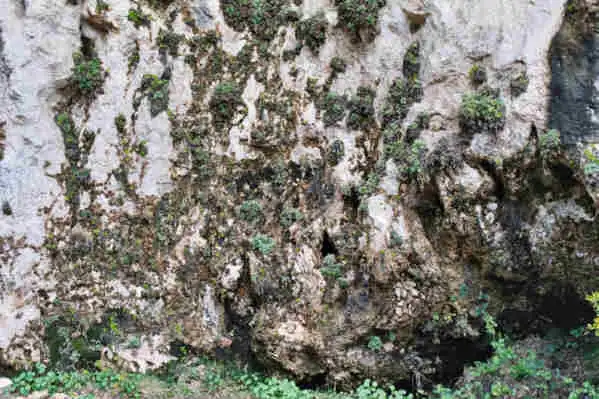 Pinguicula vallisneriifolia growing directly in the calcareous rock. Note the black leaves overhanging from the green plants : these are giving an idea of the long leaves of last year. This species is abundant in this location. Photo : Eric Partrat - April 2003 - |